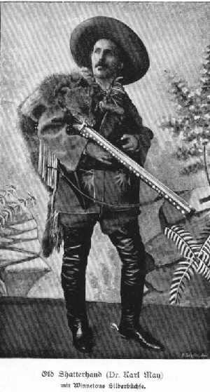 But there are other occurrences, and in these, we may not light-heartedly discharge Karl May. After the journey to the Orient and his nervous breakdowns, Karl May declared that his true work should begin only now, and while he wrote symbolist, pacifistic pieces, missing any traits of adventure stories, but providing long religious and philosophical discourses, he published, at that time, a last Winnetou romance, exalting the American Indians, preaching his message of love and understanding, but also of improvement and progress by technological development. There, nevertheless, he wove into this novel the legend of Old Shatterhand, the identification of the scout with the author, and reproached former listeners to his speeches, who had challenged the existence of his famed weapons.