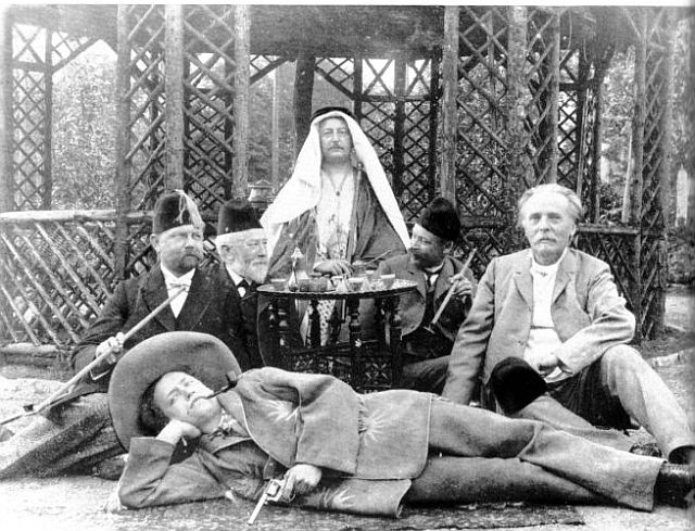 It was shot by Klara May in the year 1906 in May’s orchard, in the days during which he took a symbolist turn. In the foreground, pipe in mouth, Colt in hand, we see a certain Rudolf Kafka. Whereas the other persons are friends of Karl May, Kafka is a protégé of the writer, who lived temporarily in the Villa ‘Shatterhand’. He was a gifted musician and was, from time to time, supported financially by Karl, but much to the annoyance of Klara May. Two things are remarkable about this photo.